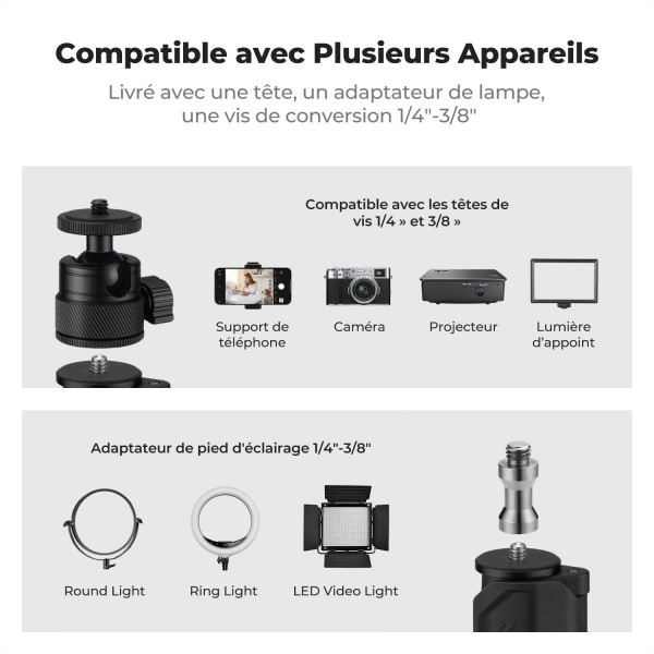 Support de bureau avec : pince en C, rotule, adaptateur pour pied et support téléphone.